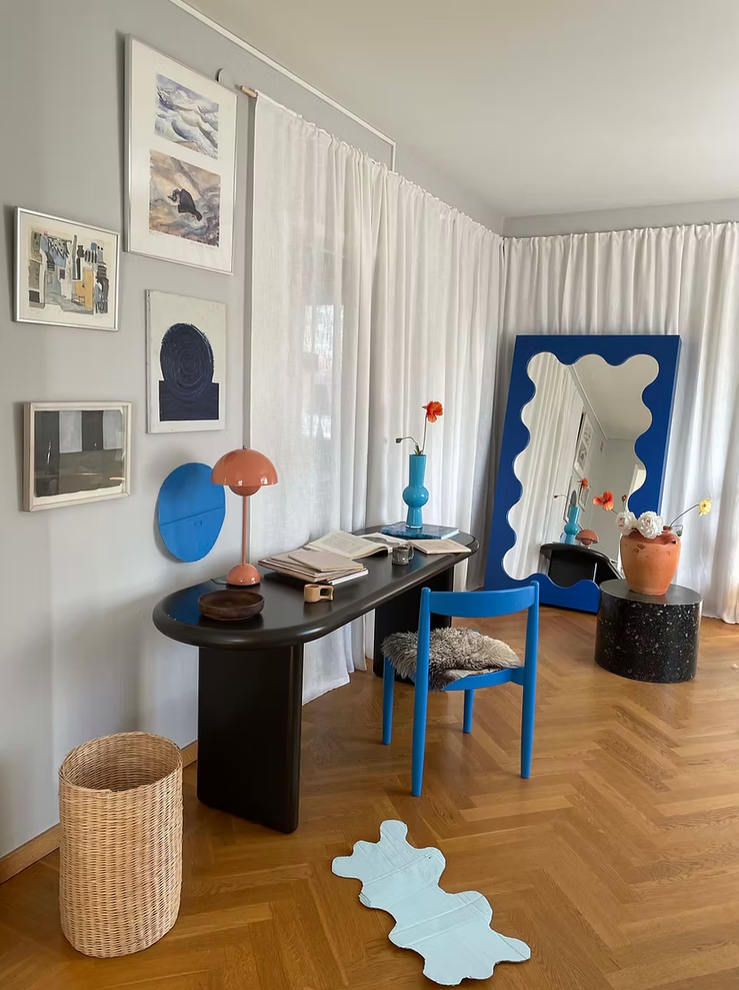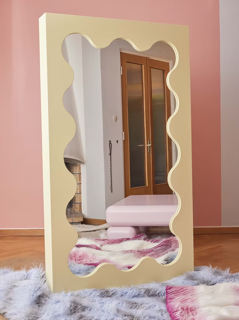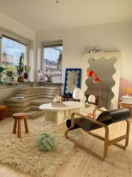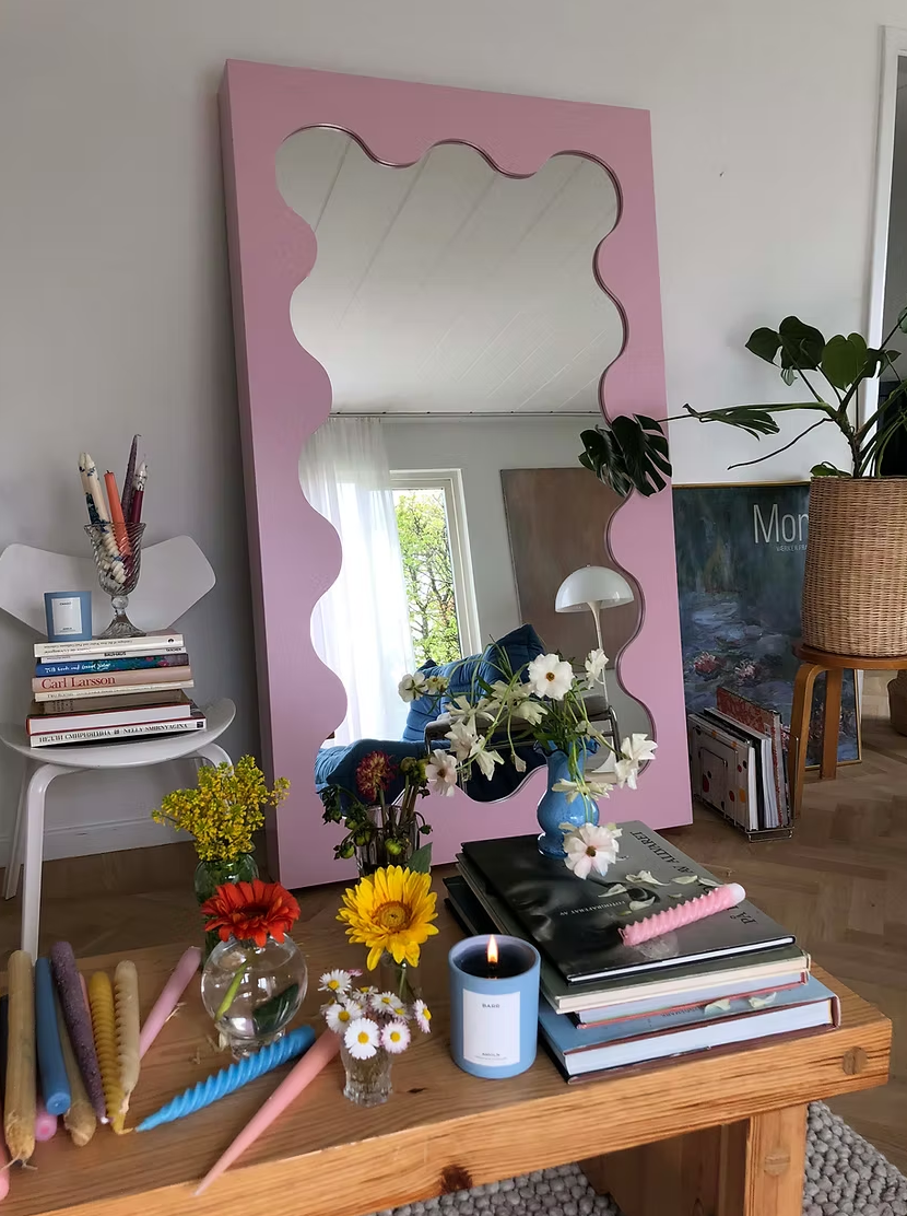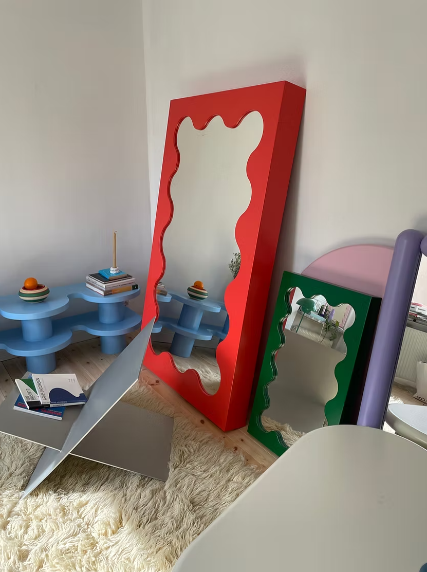 2020年1月,初出茅庐的Gustaf为瑞典时尚造型师Hanna MW的公寓设计了一面独特的波浪边框立镜Curvy Mirror(曲线镜)。也许连他自己也没想到,这个偶然之作在不久后便成为风靡全球的时尚符号。短短数月,从时尚博主Marie Wibe Jedig到造型师Trine Kjær,这面镜子几乎成了所有斯堪的纳维亚时尚icon的标配,随之掀起的追捧热潮至今未消,就连欧美乐坛新星Olivia Rodrigo、Tyler, the Creator也成为了他的忠实拥趸。