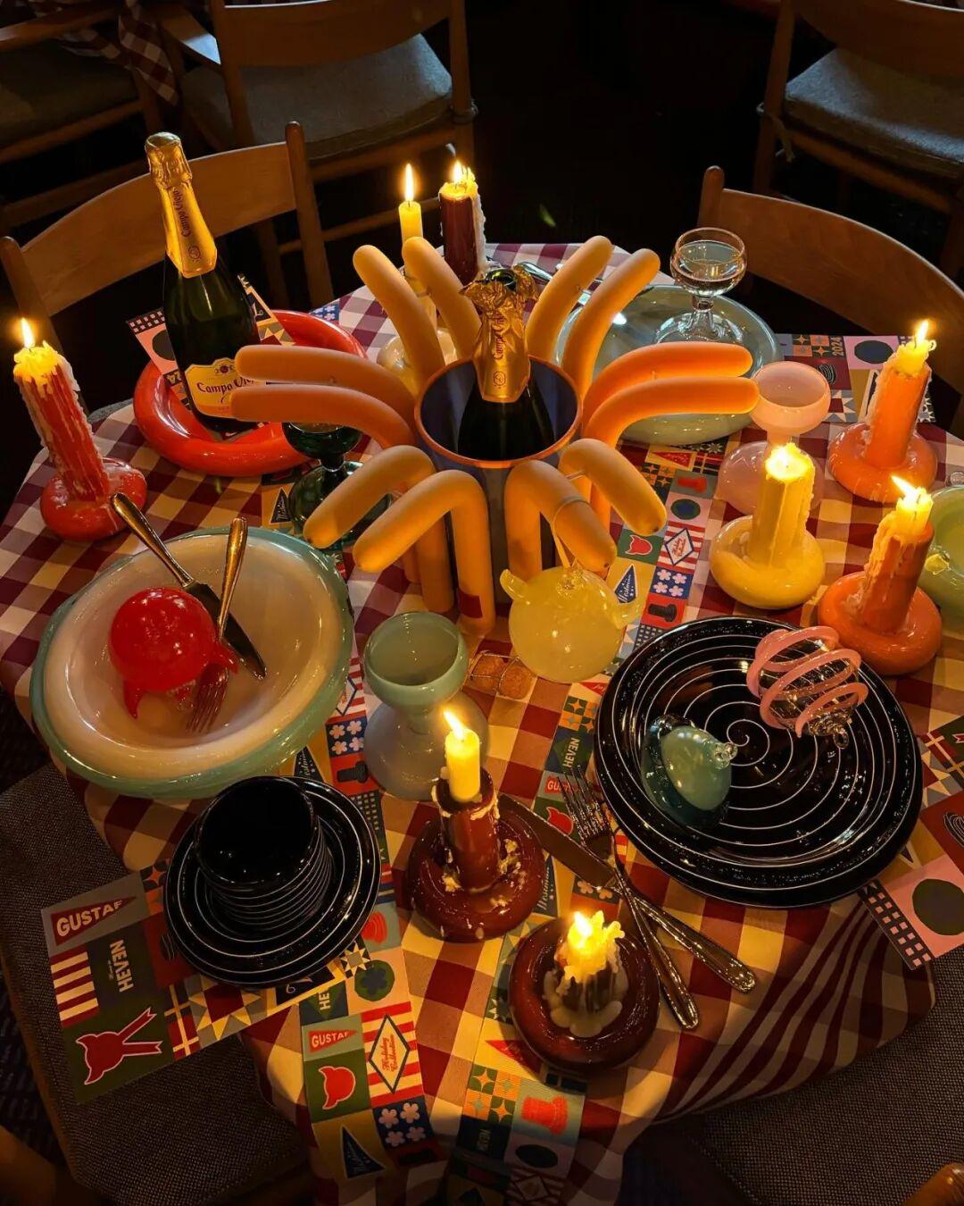 最初,这个系列计划以圣诞节作为主题进行构思。但随着讨论的深入,双方意识到相比某个特定节日,“庆祝”本身才是更具共通性的语言。无论在什么文化里,冬季都有值得庆祝的节日,而这些庆祝几乎都离不开“食物”。于是,它从圣诞的框架里跳脱出来,转向一个更开放的“庆祝场景”。多巴胺色的餐具、摇曳的蜡烛、小巧的装饰,为餐桌加了一层滤镜,日常秒变派对。